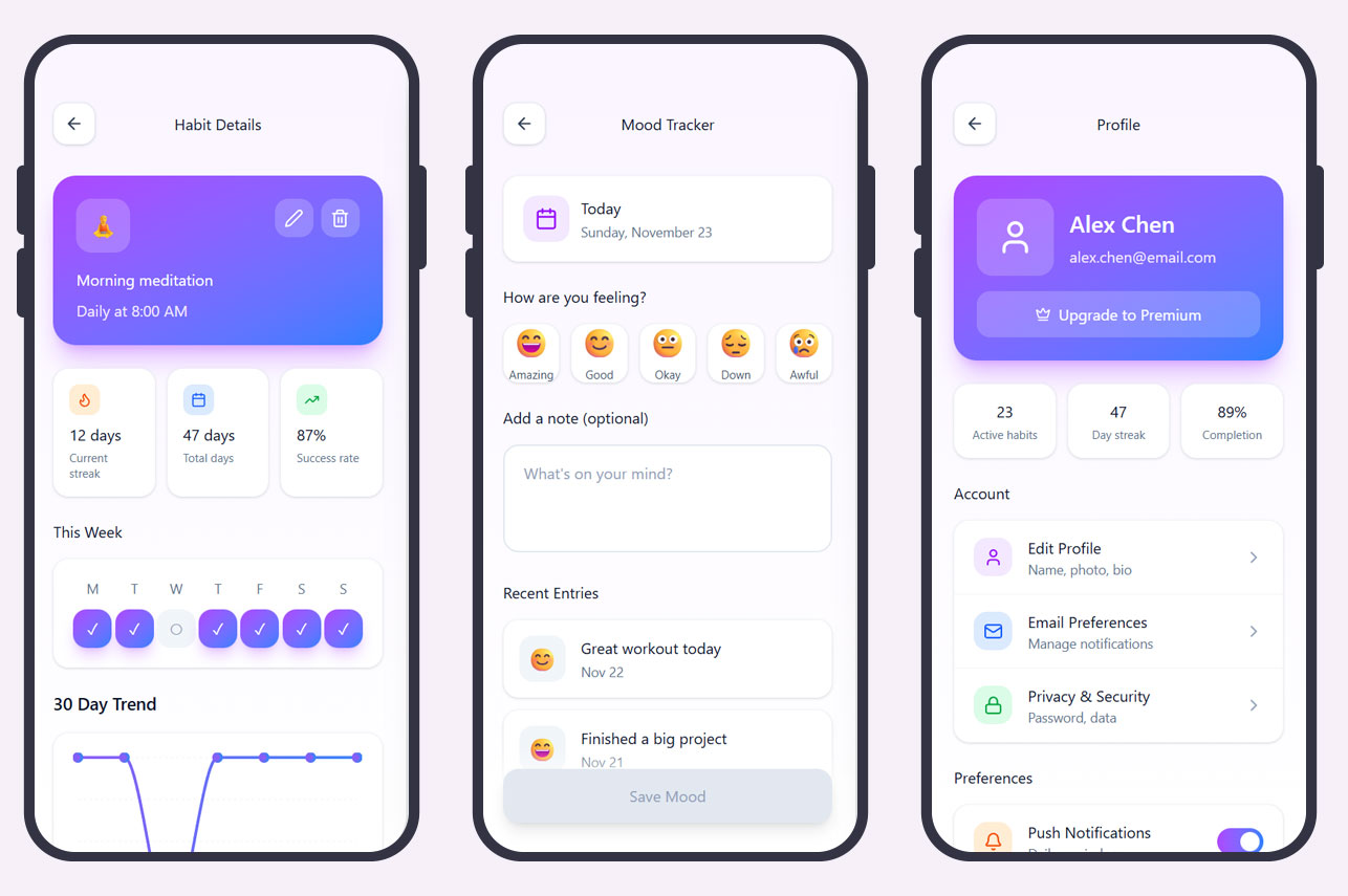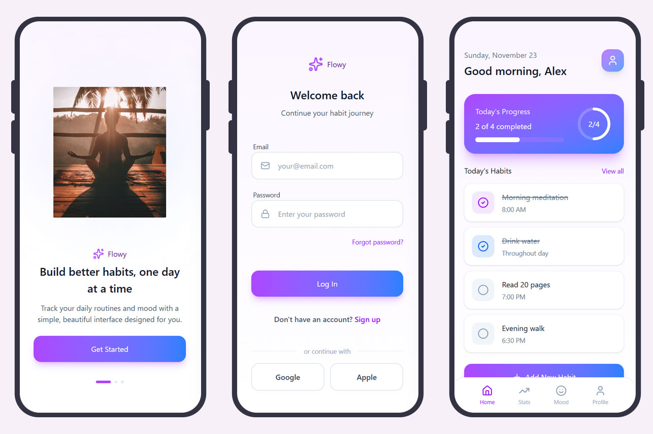 Outlined a minimal end-to-end journey: onboarding → login → home → details → mood → profile.